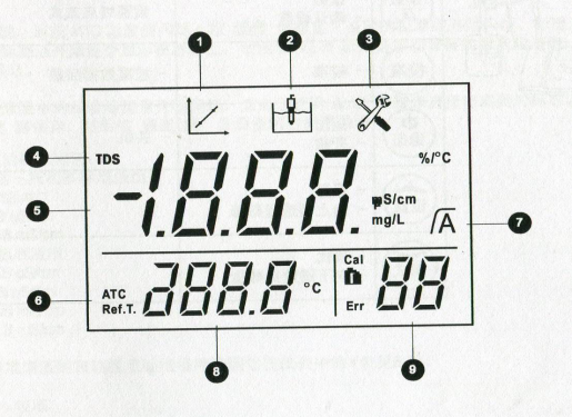 ④TDS因子設(shè)置或參數(shù)設(shè)置            ⑤電導(dǎo)率/TDS讀數(shù)或電極常數(shù)       ⑥自動溫度補(bǔ)償